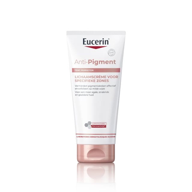 De Eucerin Anti-Pigment Lichaamscrème voor Specifieke Zones bevat een combinatie van krachtige actieve ingrediënten die op verschillende manieren werken om de huid te laten stralen en hyperpigmentatie bij de bron te verminderen door donkere vlekken, verdikking van de huid op wrijvingsplekken (knieën, ellebogen) en kleine zones met post-inflammatoire hyperpigmentatie effectief zichtbaar te verminderen.