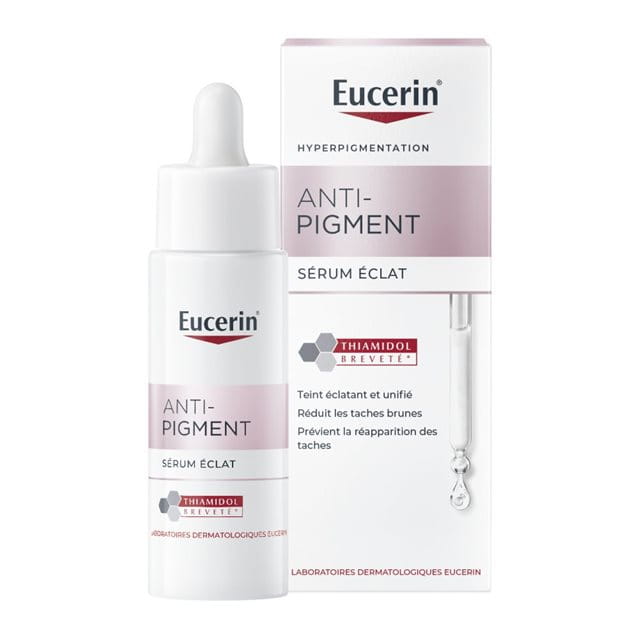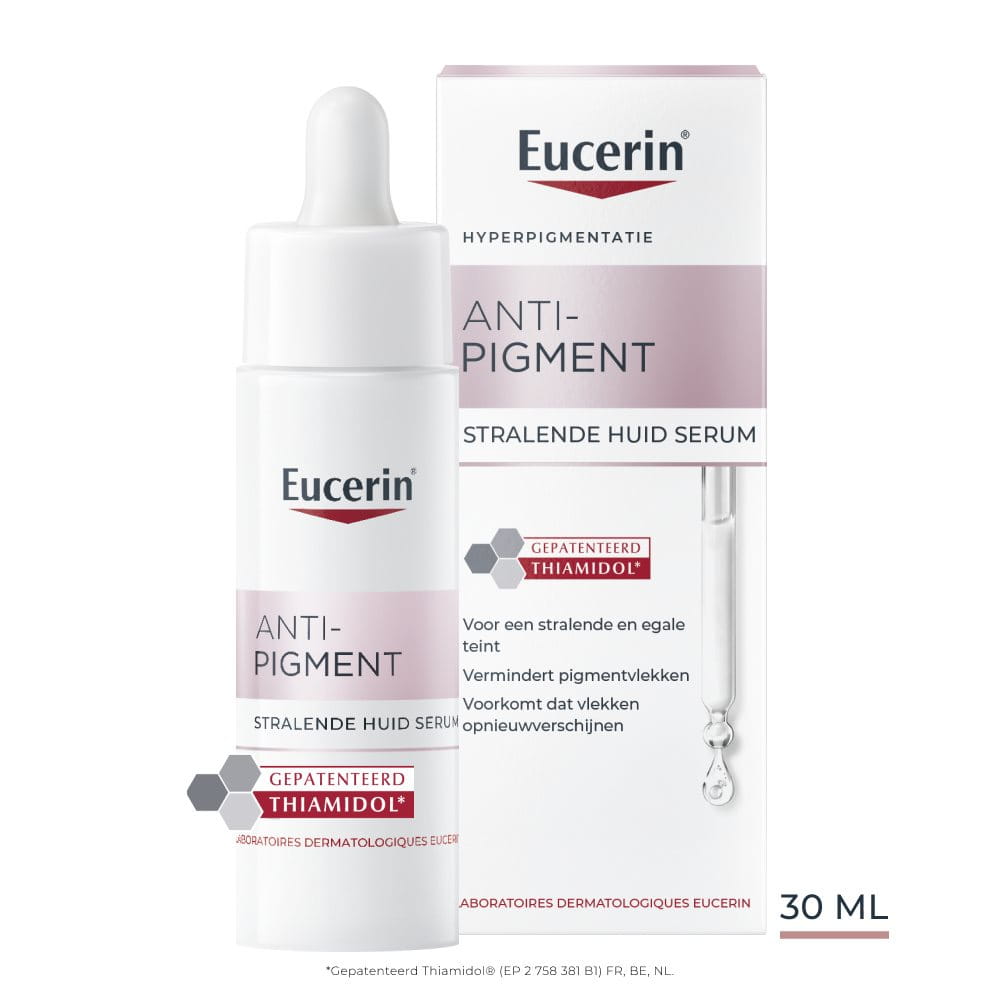 Melanine is een natuurlijk pigment dat de kleur van de huid bepaalt. Blootstelling aan zonlicht, hormonale invloeden en huidveroudering kunnen de melanineproductie stimuleren en hyperpigmentatie veroorzaken. Hyperpigmentatie verschijnt als donkere vlekken, pigmentvlekken of ouderdomsvlekken (ook wel zonnevlekken genoemd), waardoor de huid een ongelijkmatige indruk maakt. Eucerin Anti-Pigment Stralende Huid Serum bevat een combinatie van krachtige actieve ingrediënten die op verschillende manieren inwerken om de huid te laten stralen en pigmentvlekken bij de bron aan te pakken :