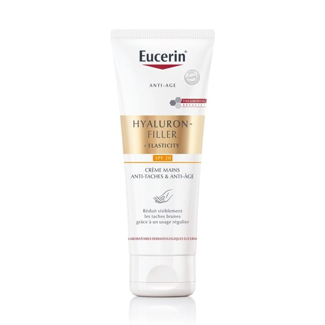 Hyaluron-Filler + Elasticity Anti-Pigment & Anti-Age Handcrème wordt gemaakt met behulp van een unieke formule die anti-age effecten biedt. Eucerins innovatieve combinatie bevat zowel hoog als laag moleculair Hyaluronzuur om diepe rimpels zichtbaar op te vullen, en werkt naast Arctiin, een actief ingrediënt waarvan is bewezen dat het de vernieuwing van collageen in de cellen versnelt2. De crème bevat ook Thiamidol1, een effectief en gepatenteerd ingrediënt dat de hoofdoorzaak van hyperpigmentatie tegengaat door de productie van melanine te verminderen. Hiervan is klinisch en dermatologisch bewezen dat het bruine vlekken vermindert en het terugkeren ervan helpt te voorkomen. De eerste resultaten zijn zichtbaar na twee weken3 en verbeteren continu bij regelmatig gebruik.