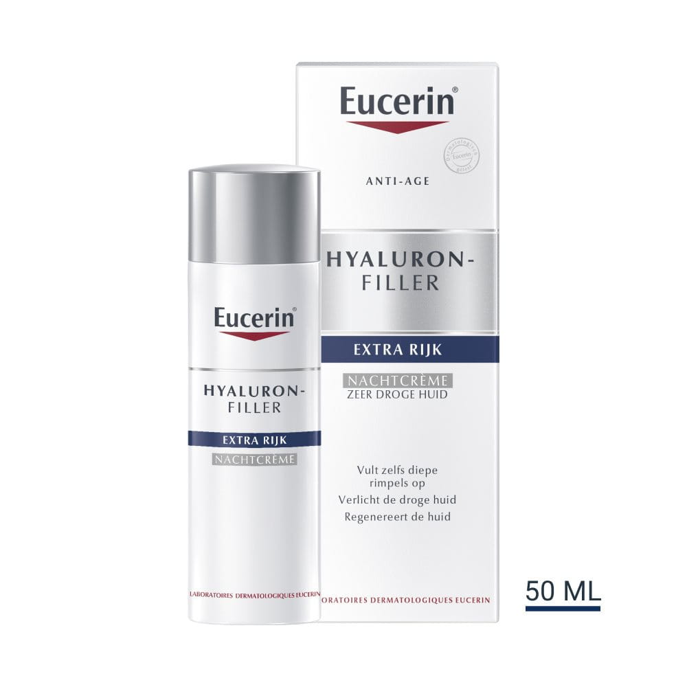 Eucerin Hyaluron-Filler Extra Rijk Antirimpel Nachtcrème heeft een formule voor mensen met een zeer droge huid met rimpels. Ureum houdt vocht vast, Hyaluronzuur vermindert droogtelijntjes en Ceramide-3 regenereert de huid gedurende de nacht. Hyaluron-Filler Extra Rijk Antirimpel Nachtcrème wordt goed verdragen en is zelfs geschikt voor mensen met psoriasis. Door de zachte textuur van de crème voelt de huid aangenaam aan