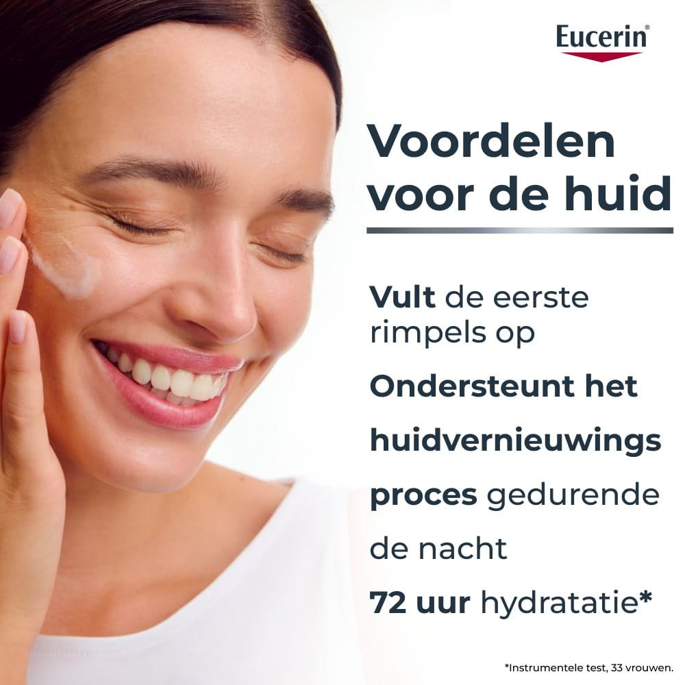 De huid verliest 's nachts vocht, met droogheid, fijne lijntjes en een doffe teint als gevolg. Een goed samengestelde nachtgel moet intensief hydrateren, het herstellend vermogen van de huid ondersteunen en de huid meer laten stralen, en daarbij lichtgewicht en niet vet zijn. De Eucerin Hyaluron-Filler + 3x Effect Hydratatie Booster Nacht Gel-Crème is een hydratatiebooster gedurende de nacht met Hyaluronzuur, Provitamine B5 en Glycerine, die is ontwikkeld om tot 72 uur* te hydrateren en zichtbaar de eerste rimpels op te vullen. De ultralichte geltextuur trekt snel in, waardoor deze geschikt is voor alle huidtypes, ook voor de gevoelige huid.