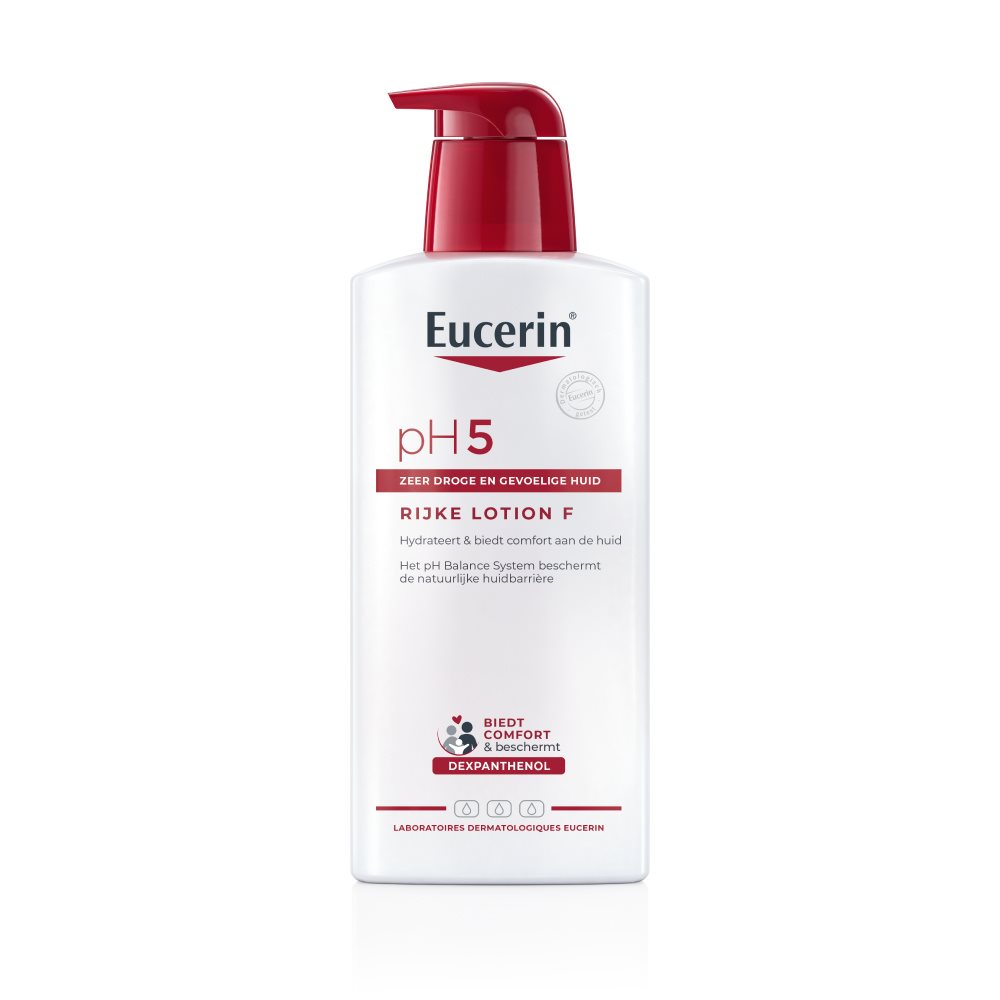 De gevoelige huid heeft speciale verzorging nodig om weerstand te bieden aan schadelijke invloeden van buitenaf. Geef comfort aan uw huid en bescherm deze met Eucerin pH5 Rijke Lotion F. Geef uw huid een nieuw gevoel van welzijn. De formule, verrijkt met 5% Dexpanthenol, verzacht en hydrateert de huid en biedt onmiddellijk comfort. De huid is gehydrateerd en de pH-waarde wordt gerespecteerd. Zelfs de meest gevoelige huid wordt versterkt, beschermd en voelt weer comfortabel aan. Gebruik de Eucerin pH5 Rijke Lotion F dagelijks voor een zachte en soepele huid. Deze Lotion is geschikt voor dagelijks gebruik, zelfs voor de allergiegevoelige huid - type 1 allergie (b.v. hooikoorts) en bij kinderen vanaf 3 jaar.