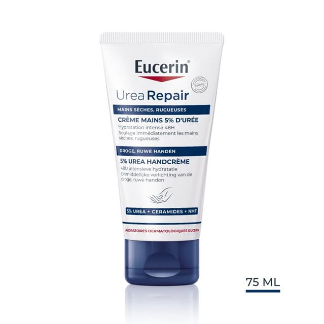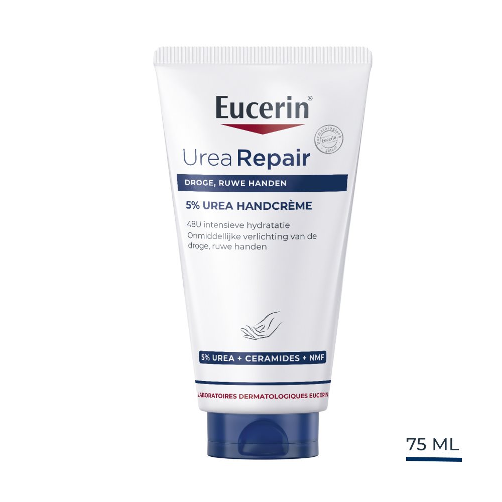 De Eucerin UreaRepair 5% Urea Handcrème geeft de droge en ruwe huid van de handen de dagelijkse verzorging die ze nodig hebben. De crème bevat een specifieke combinatie van ingrediënten: 5% Urea, Ceramiden en andere Natuurlijke Hydratatiefactoren (NMF's, Natural Moisturizing Factors), die vocht binden en helpen de natuurlijke beschermende barrière van de huid te versterken om haar te beschermen tegen meer vochtverlies.