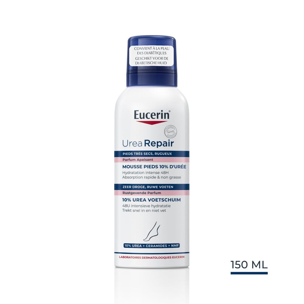 Het Eucerin UreaRepair 10% Urea Voetschuim verzorgt droge voeten door de zeer droge, ruwe huid van de voeten te voorzien van de intensieve hydratatie die ze nodig heeft.Dit schuim bevat een unieke combinatie van ingrediënten – 10% Urea, Ceramiden en Natuurlijke hydratatiefactoren (NMF's) – die vocht vasthouden en het herstel van de natuurlijke beschermende huidbarrière ondersteunen om de huid te beschermen tegen verder vochtverlies.