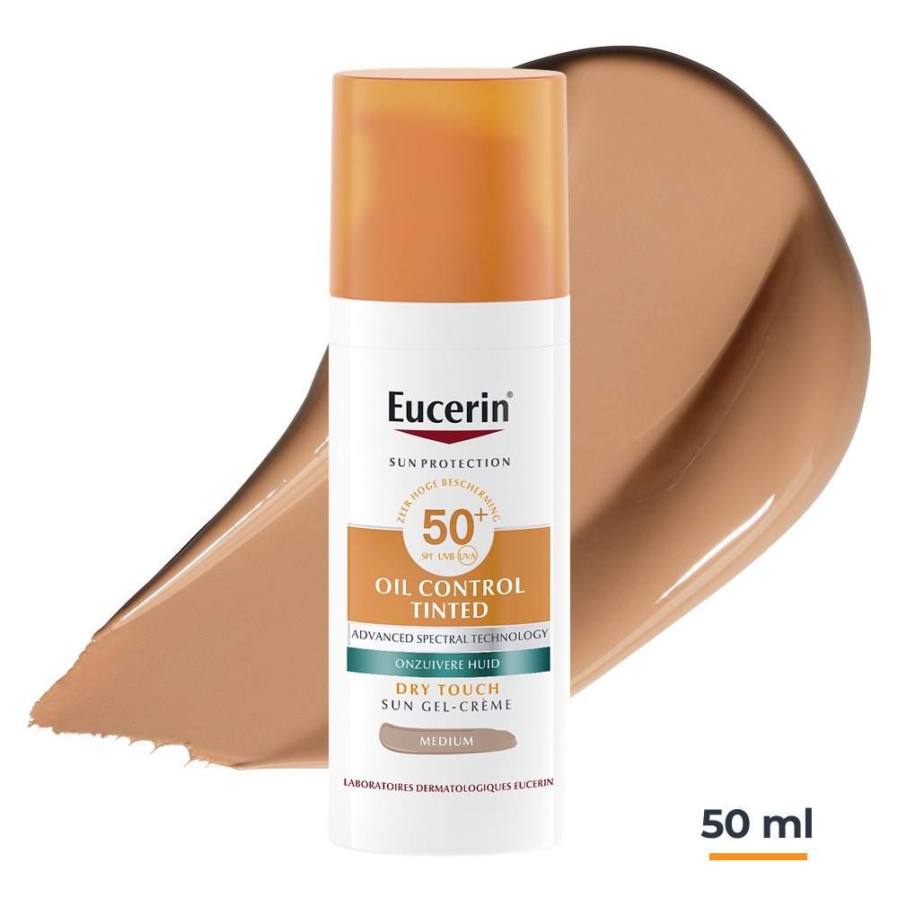 Veel zonnebeschermingsproducten zijn te zwaar voor de vette en acnegevoelige huid en laten een vette finish achter. Met deze Sun Oil Control Gel-Crème SPF 50+ Tinted Medium zonnebescherming biedt Eucerin een ultralicht alternatief met een natuurlijke look. De dry-touch formule met de Oil Control Technology en matterende pigmenten trekt snel in, zorgt 12 uur lang* voor een niet-glimmende en niet-vette finish en versmelt gelijkmatig met de huid voor een gevoel van lichtheid.
