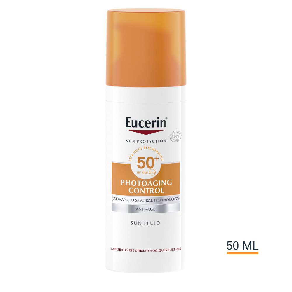 UV-licht is de belangrijkste oorzaak van door de zon veroorzaakte huidschade, maar hoog energetisch zichtbaar (HEVIS) licht kan ook vrije radicalen laten vrijkomen en die belasten de huid nog extra. Eucerin Sun Photoaging Control Anti-Age Sun Fluid SPF 50+ is een zonnebeschermingsmiddel voor het gezicht voor elke dag, voor alle huidtypes. De Advanced Spectral Technology combineert breedband- en fotostabiele UVA-/UVB-filters voor hoge UV-bescherming met Licochalcone A om de door UV-straling en HEVIS-licht veroorzaakte vrije radicalen te neutraliseren. De anti-age zonnebescherming bevat ook Glycyrrhetinezuur dat het eigen DNA-herstelmechanisme van de huid ondersteunt. De formule bevat daarnaast korte keten en lange keten Hyaluronzuur en vermindert zichtbaar rimpels in het gezicht en het decolleté. Sun Photoaging Control Anti-Age Sun Fluid SPF 50+ is ongeparfumeerd en heeft een aangename lichte textuur die snel intrekt. Klinische en dermatologische studies bewijzen een zeer goede huidverdraagzaamheid op de gevoelige huid.